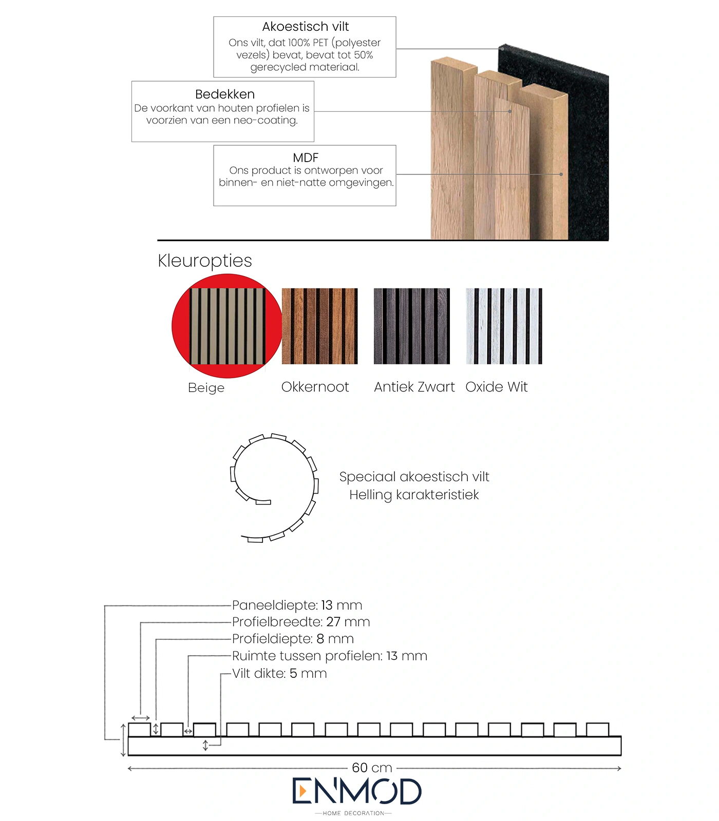 Het akoestische paneel van Enmod voorkomt echter deze echo, omdat de geluidsgolven bij contact met het paneel, bestaande uit vilt en latten, worden gebroken en geabsorbeerd. Op deze manier voorkomt het paneel de reflectie van gegenereerde geluidsgolven en dragt het bij aan een aangenamere akoestische omgeving in uw ruimte.